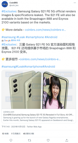 三星 Galaxy S21 FE 5G官方渲染图曝光:提供骁龙888/Eyxnos 2100双版本快讯