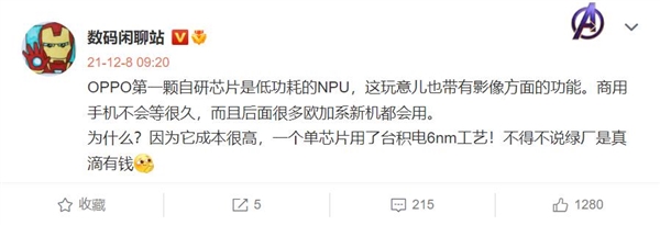 博主@数码闲聊站爆料,OPPO第一颗自研芯片为低功耗的NPU,预计很快就会量产商用。它的成本非常高,一颗单芯片就使用了台积电的6nm工艺,这次OPPO投入了巨额研发成本。