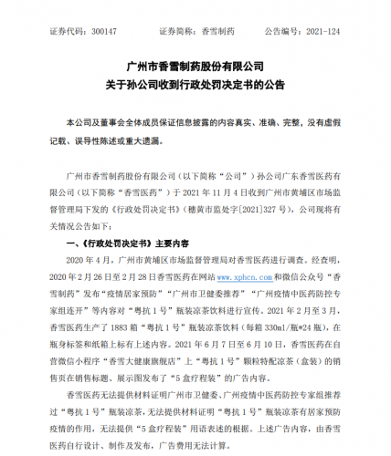 公告显示,2020年2月26日至2月28日,香雪医药在网站www.xphcn.com和微信公众号“香雪制药”发布“疫情居家预防”“广州市卫健委推荐”“广州疫情中医药防控专家组连开”等内容对“粤抗1号”瓶装凉茶饮料进行宣传。2021年2月至3月,香雪医药生产了1883箱“粤抗1号”瓶装凉茶饮料(每箱330ml/瓶*24瓶),在瓶身标签和纸箱上标有上述内容。2021年6月7日至6月10日,香雪医药在自营微信小程序“香雪大健康旗舰店”上“粤抗1号”颗粒特配凉茶(盒装)的销售页在销售标题、展示图发布了“5盒疗程装”的广告内容。因香雪医药无法提供材料证明“粤抗1号”瓶装凉茶有居家预防疫情的作用,违反广告法,被责令停止发布广告并罚款30万元。