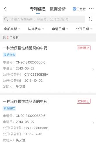 企查查APP显示,香雪医药目前仅有2条专利信息,名称为“一种治疗慢性结肠炎的中药”,专利类型为“发明公布”、“发明授权”,不过,目前这两项专利的法律状态全部为“权利终止”。