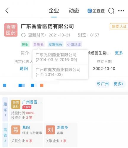 企查查APP显示,香雪医药成立于2002年,注册资本 2000万元人民币,曾用名广东兆阳药业有限公司,该公司由广州香雪医疗供应链管理有限公司全资控股,后者为香雪制药全资子公司。