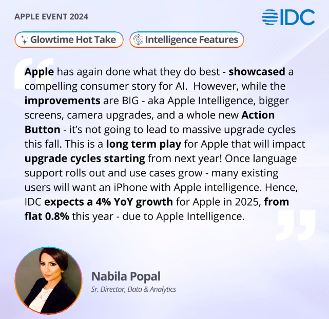 IDC D&A 高级总监Nabila Popal对苹果2024发布会给出了分析,苹果发布会iPhone 16如期而至,虽然改进是巨大的——也就是苹果智能、更大的屏幕、相机升级。