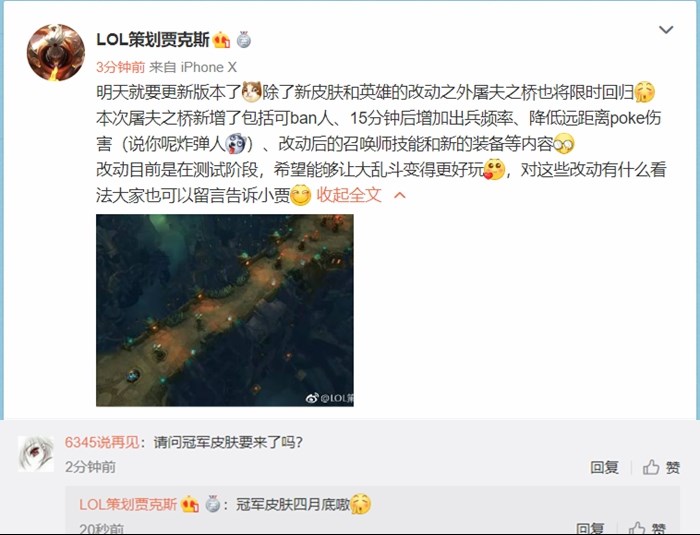 刚刚,英雄联盟游戏策划@LOL策划贾克斯 发文,透露了明日LOL更新版本的部分内容,其中除了新皮肤和英雄的改动之外屠夫之桥也将限时回归,而且本次屠夫之桥新增了包括可ban人、15分钟后增加出兵频率、降低远距离poke伤害等。