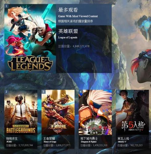 最多观看游戏是《英雄联盟》,总播放量4849577478次,其次是《绝地求生》和《王者荣耀》。