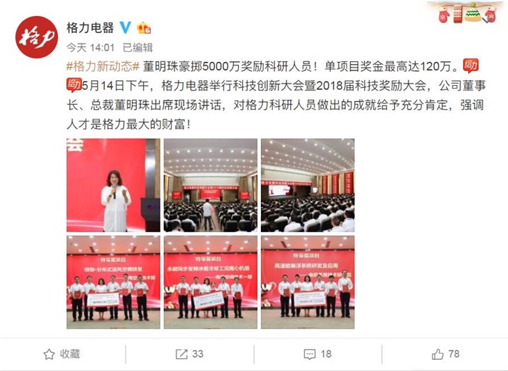官方称,5月14日下午,格力电器举行科技创新大会暨2018届科技奖励大会,公司董事长、总裁董明珠出席现场讲话,对格力科研人员做出的成就给予充分肯定,强调人才是格力最大的财富。
