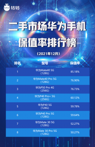 转转集团提供的2021年12月华为手机二手市场保值率数据显示,华为Mate 40 (5G)、Mate40 Pro(5G)分别以85.18%和76.80%的保值率包揽榜单前二,和11月相比保值率分别下降了6.6%和7.08%。