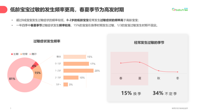 过敏与宝宝月龄、饮食习惯和居住环境有密切的关系。通过调研对比发现,低龄宝宝过敏的发生频率更高,0-2岁的低龄宝宝经常发生过敏症状的频率高于高龄宝宝,达37%。一年四季中春夏季节过敏症状发生频率较高,15%的宝宝在换季时期发生过敏,约1/3的宝宝不定季过敏。过敏性疾病已成为影响母婴人群健康及生活的重要因素,超过80%的宝妈表示过敏对自己和宝宝的生活造成了影响,1/3表示影响较为严重。