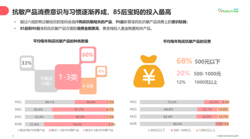此外,报告还显示,85后和90后宝妈在抗敏产品方面的消费金额更高,36.6%的85后宝妈平均每年购买抗敏产品的花费超过500元,90后宝妈的比例次之,为35.4%。相较之下,95后新晋宝妈在抗敏产品消费上的意识较弱,27.8%的宝妈平均每年购买抗敏产品的花费超过500元。