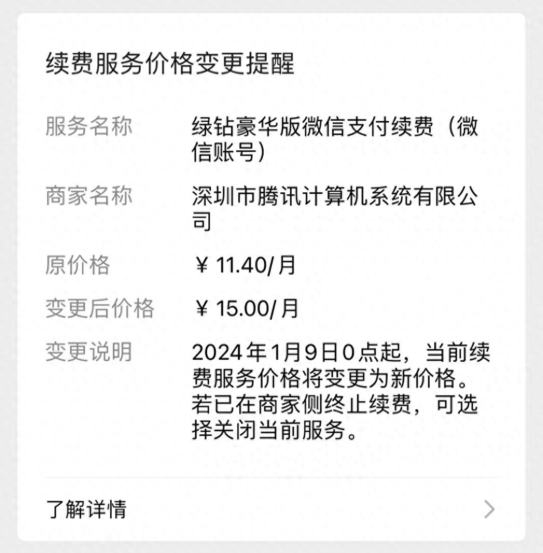 12月4日,根据QQ音乐用户在社交媒体上的反馈,他们收到微信支付通知,QQ音乐绿钻豪华版自动续费价格将由此前的11.4元/月上调至15元/月,该调整将自2024年1月9日0点起变更生效。不愿意接受的用户可以在该时间点之前,前往微信自动续费管理页面取消。