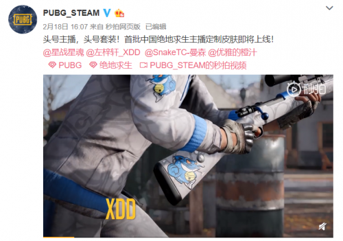 从今日开始,四位中国主播的专属皮肤将持续4周进行限时销售,一旦错过的话,后续就有可能成为绝版皮肤了。因此,喜欢这些皮肤和玩家们千万不要错过这次的销售活动,除此之外,大家关注PUBG官方微博的最新活动,也有机会成为幸运儿,免费领取这些精美皮肤!