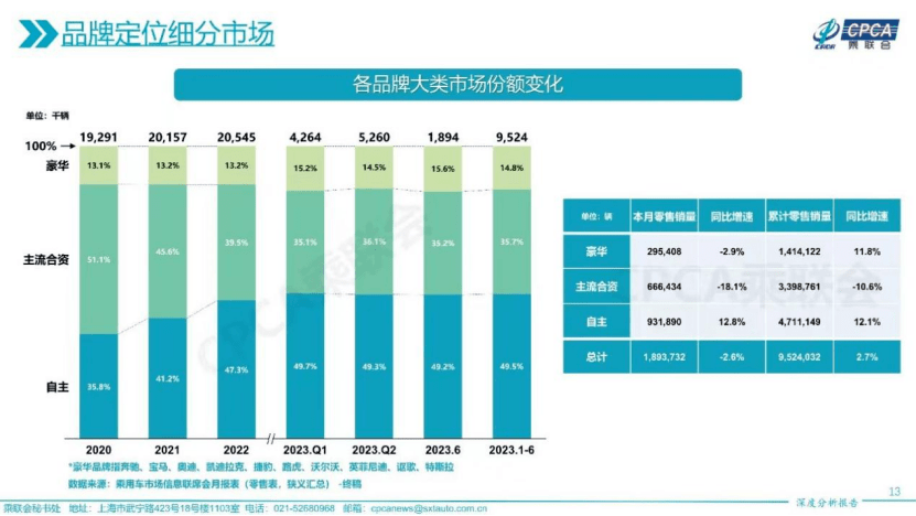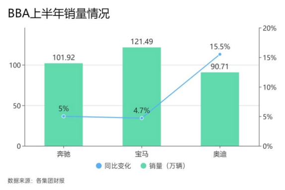 今年上半年,豪华品牌在华销量同比增长11.8%,累计零售量超100万台。对于BBA来说,中国市场体量大,销量占比基盘逾三成以上,奔驰、宝马、奥迪在中国市场都实现了正增长。
