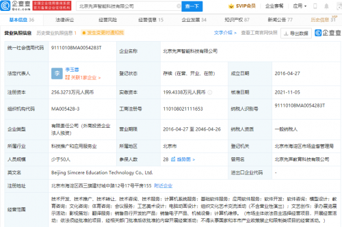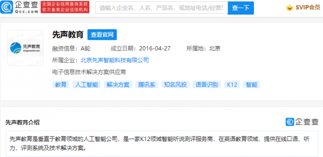 企查查信息显示,先声教育是一家K12领域智能听说测评服务商,公司成立于2016年,法定代表人为李玉蓉,注册资本256.33万元人民币,经营范围包含:工艺美术设计;电脑动画设计;文艺创作;承办展览展示活动;影视策划等。