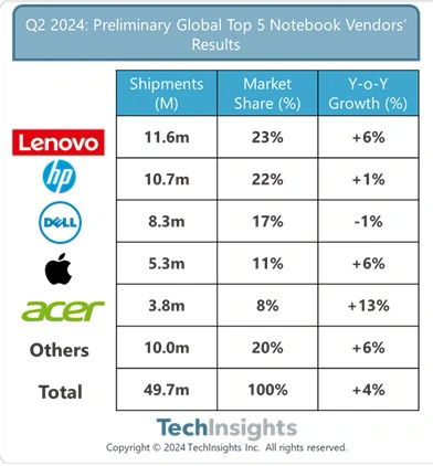 ▲ 2024 年 Q2 全球前五大笔记本电脑厂商出货量(初步结果)