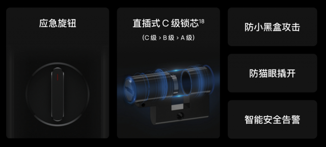 防盗门是家庭安全第一道防火墙,而门锁则是这道防火墙中最关键的一点,华为智能门锁系列采用直插式C级锁芯,具备防钻、防拉、防撬、防锯、防冲击、防技术开启六项全能防盗技术。即使外面板被撬,依旧是一把靠谱的机械门锁,安全性拉满。