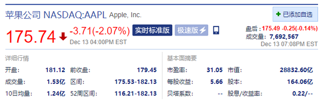据Refinitiv Eikon数据,摩根大通上调了苹果的目标股价,从每股180美元上调为210美元,这也是所有华尔街分析师中最高的目标股价;12月13日收盘时,苹果股价显示为175.74美元,当天股价下跌了2.07%。