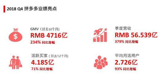 2018财年全年总营收为131.2亿元人民币,同比增长652%。全年归属于普通股东的净亏损为102.97亿元人民币,上年同期亏损4.99亿元。2018年,拼多多的商品成交总额(GMV)为4716亿元人民币(约合687亿美元),同比增长234%;平台年度活跃买家数达4.185亿,较2017年同期增1.737亿。