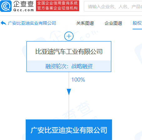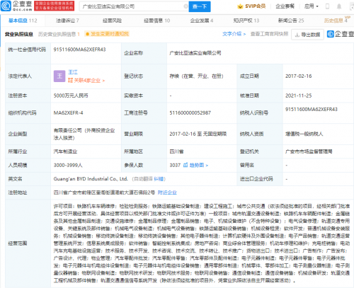 企查查信息显示,该公司成立于2017年,法定代表人为王江,注册资本5000万元人民币,由比亚迪汽车工业有限公司100%控股。