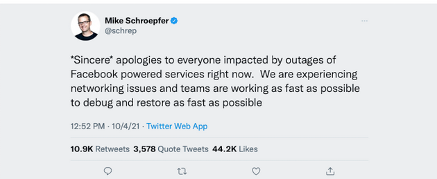 Facebook史上最严重宕机 全网宕机近七小时高管赴推特道歉快报