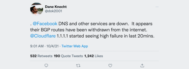 网络服务公司Cloudflare的专家Dane Knecht在Twitter上表示,Facebook应该是遭遇了BGP边界网关协议中断故障,才会导致全网所有服务都无法连接。而一名自称是Facebook网络工程团队的匿名员工则在Reddit上透露,此次故障有可能是数据中心的技术硬件问题。Facebook目前正在数据中心进行现场检修。