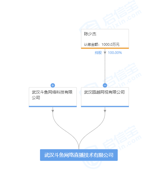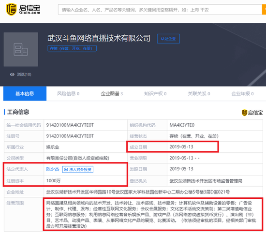 启信宝数据显示,2019年5月13日,武汉斗鱼网络科技有限公司新增对外投资,成立武汉斗鱼网络直播技术有限公司,法定代表人为斗鱼CEO陈少杰,注册资本1000万。