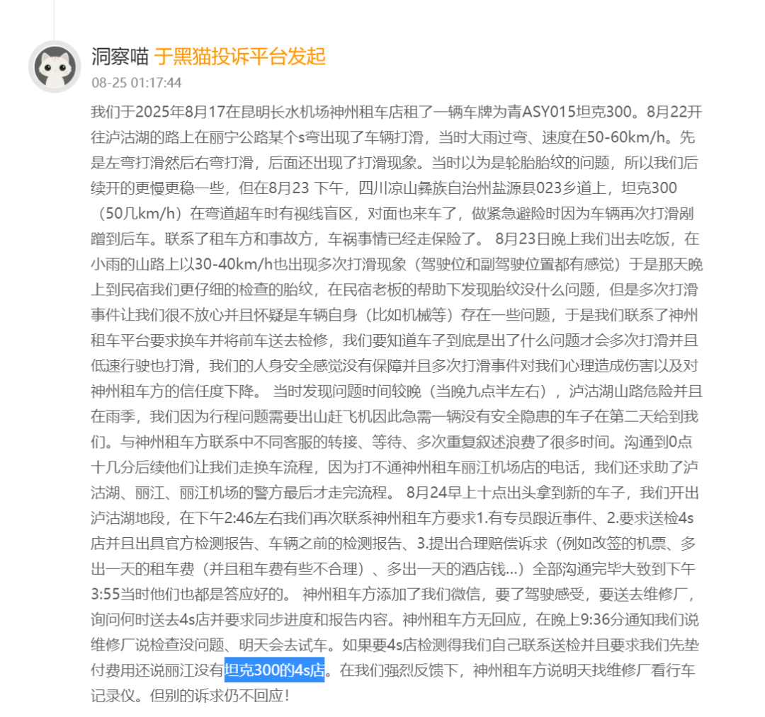 无独有偶,其他平台亦有用户投诉神州租车存在车辆质量与服务响应问题。据黑猫投诉平台显示,一位消费者于2025年8月17日在昆明长水机场神州租车门店租用坦克300,在前往泸沽湖途中正常行驶时多次出现车辆打滑并引发剐蹭事故。用户排除轮胎磨损因素后,质疑车辆本身存在机械故障,遂要求神州租车更换车辆并送检。