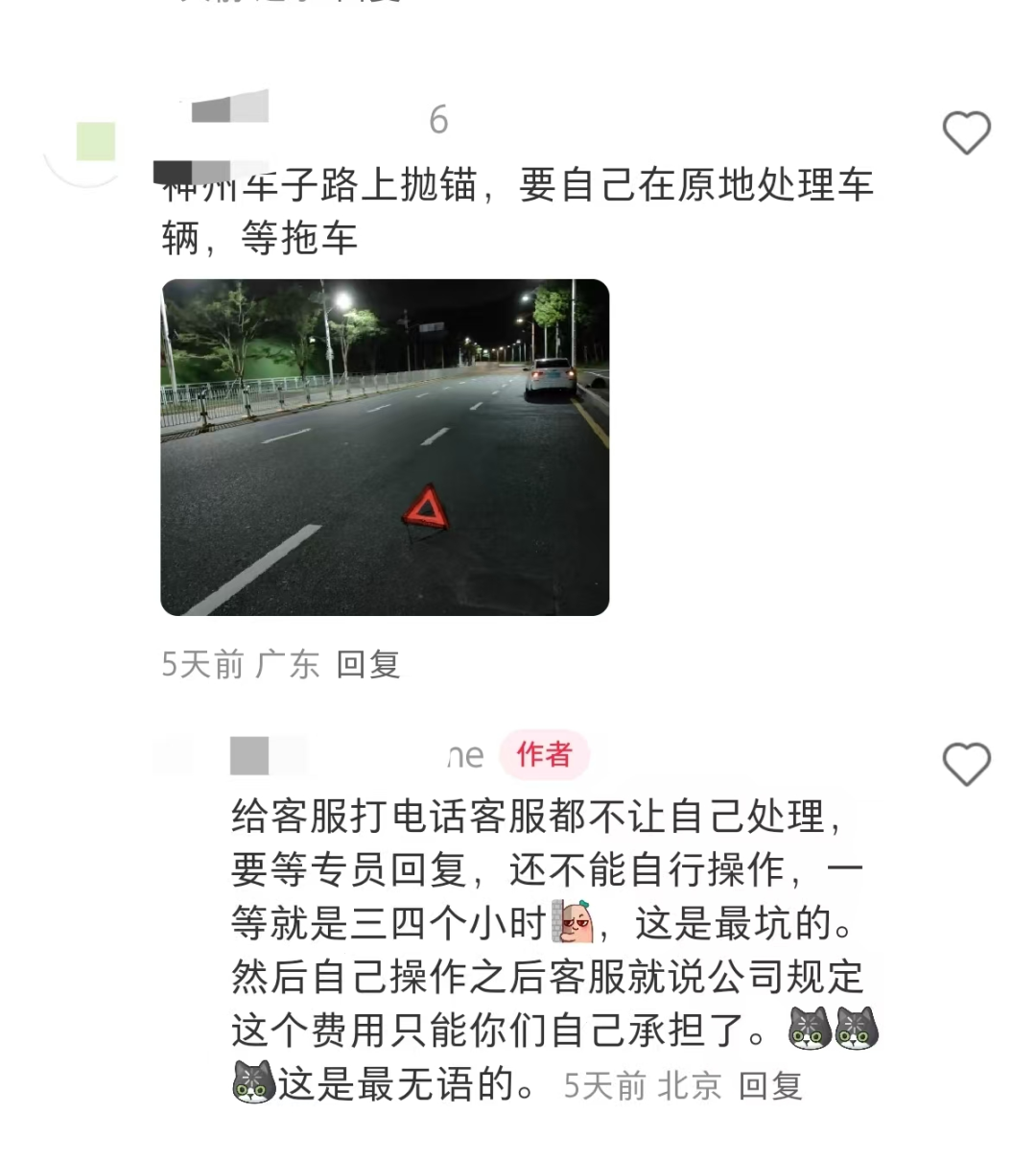 该贴文在网络上引发热议,其评论区也有人用自身经历吐槽神州租车。有人表示,租的车半路熄火、车内卫生有问题,半路抛锚要等三四个小时才能处理、刹车片快磨没了……在评论区与网友吐槽的过程中,当事人还补充了神州租车的“离谱操作”:(车子有问题后)给客服打电话,客服都不让自己处理要等专员回复,一等就是三四个小时。如果等不及了自己操作,“之后客服就说公司规定这个费用只能你们自己承担了,这是最坑最无语的”。