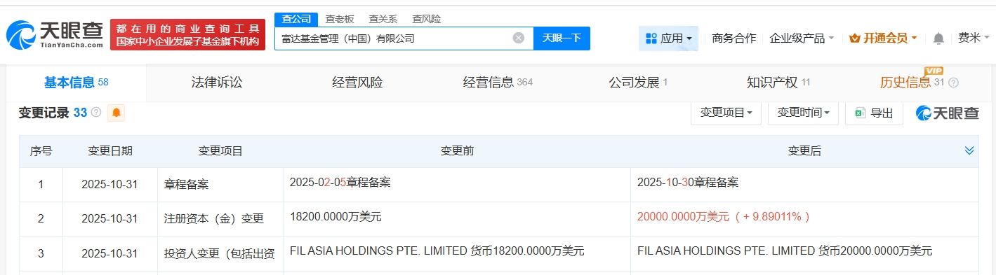 天眼查App显示,近日,富达基金管理(中国)有限公司发生工商变更,注册资本由1.82亿美元增至2亿美元,增幅约10%。
