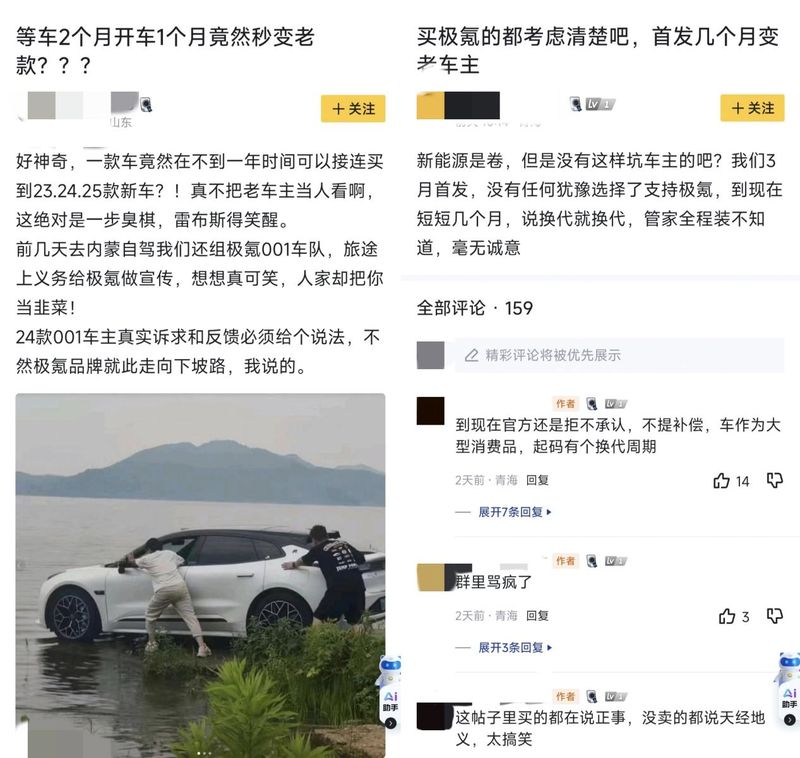 尽管这两年中国车市竞争激烈,各家改款车型越来越快,但改款时间快到只有8个月甚至6个月,依然相当罕见。不少今年购买了新款极氪001的用户在社交平台连连“喊冤”,称极氪背刺老车主。