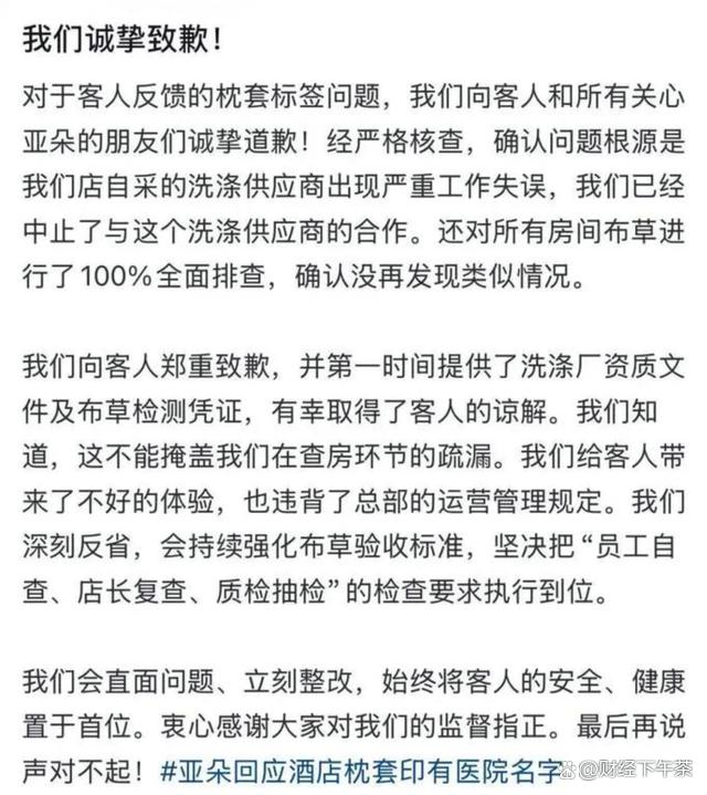 看得出,亚朵方面的道歉是明显的,解释事发理由的逻辑比较通,回应是迅速的,解决方案是有可行性的。然而这起事件最大的危机其实来自于“枕套”这个关键词。