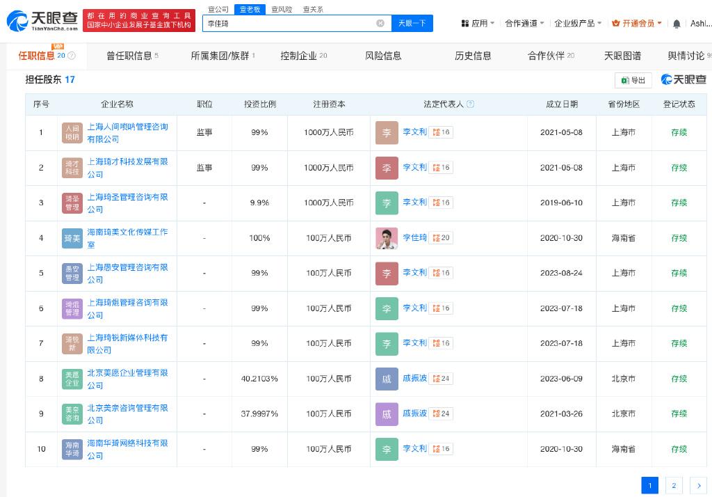 值得注意的是,其中多家公司为李佳琦与母亲李文利共同关联公司,李佳琦持有多家公司99%的股份,李文利持有1%的股份并担任法定代表人、执行董事职务。