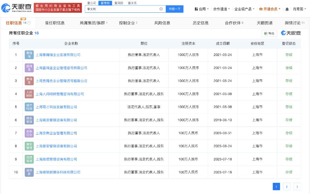 天眼查商业履历信息显示,李文利名下关联16家企业,其中12家为存续状态,包括上海春琦瑞企业发展有限公司、上海盛琦圣企业管理咨询有限公司、上海贵琦忠企业管理咨询有限公司等,涉及企业管理、科技、新媒体等领域,李文利在上述企业中担任执行董事、法定代表人等职务。