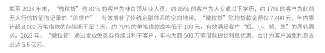 据微众银行年报披露,截至2023年末,“微粒贷”逾81%的客户为非白领从业人员,约85%的客户为大专或以下学历,约17%的客户为此前无人民银行信贷征信记录的“首贷户”。