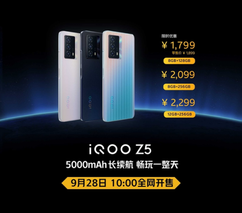 【TechWeb】9月23日,iQOO推出了全新的iQOO Z5中端机型,定位是性能先锋,除了拥有骁龙778芯片、满血版LPDDR5内存和满血版UFS 3.1闪存的性能铁三角之外,屏幕也是该机的一大看点,一经发布便受到了不少用户的欢迎。现在有最新消息,近日iQOO官方发布最新预告,该机将于9月28日也就是今天上午10点正式发售,售价1799元起。