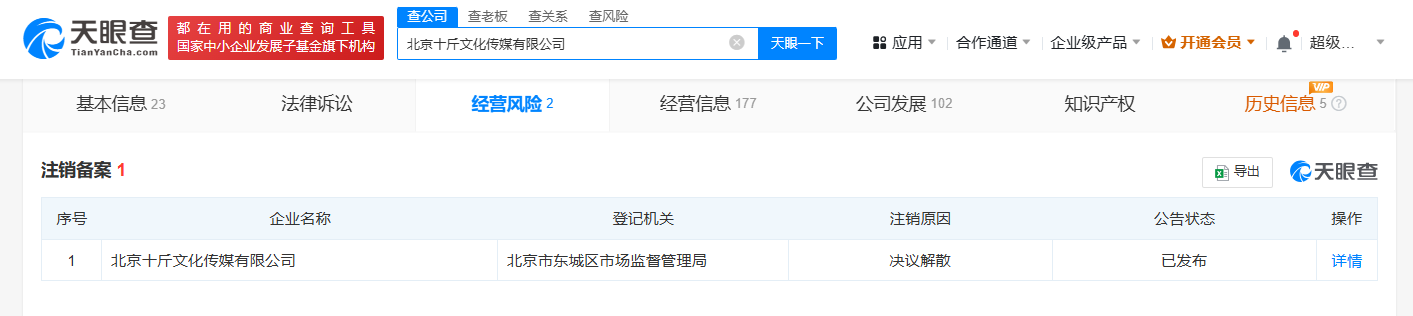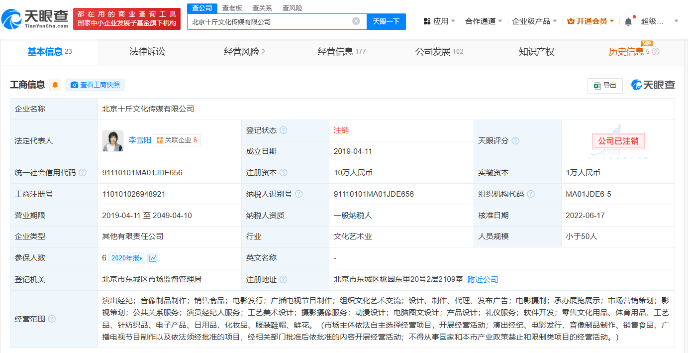 天眼查App显示,北京十斤文化传媒有限公司成立于2019年4月,注册资本10万人民币,法定代表人、执行董事、经理为李雪阳(李雪琴)。变更记录显示,2021年5月,李雪阳(李雪琴)退出该公司股东,新增上海酥年文化艺术策划合伙企业(有限合伙)为股东,后者由李雪琴妈妈贾凤春和杨凡共同出资。2022年3月,该公司发布注销公告,注销原因为决议解散,清算组负责人为李雪阳(李雪琴)。目前,该公司已于2022年6月注销。