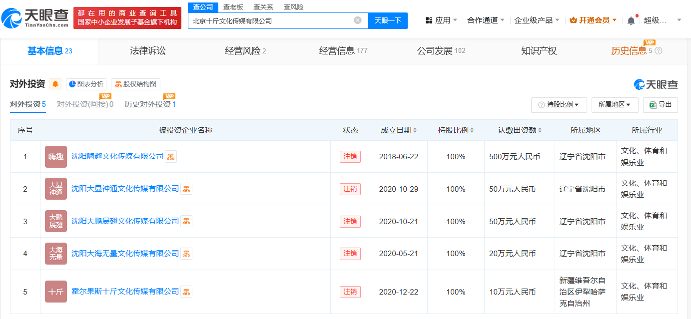 值得注意的是,北京十斤文化传媒有限公司及其5家子公司注销原因均为决议解散。其中,举报李雪琴的谢田飞担任霍尔果斯十斤文化传媒有限公司、沈阳嗨趣文化传媒有限公司法定代表人,而谢田飞还为霍尔果斯十斤文化传媒有限公司注销备案的债权申报联系人。