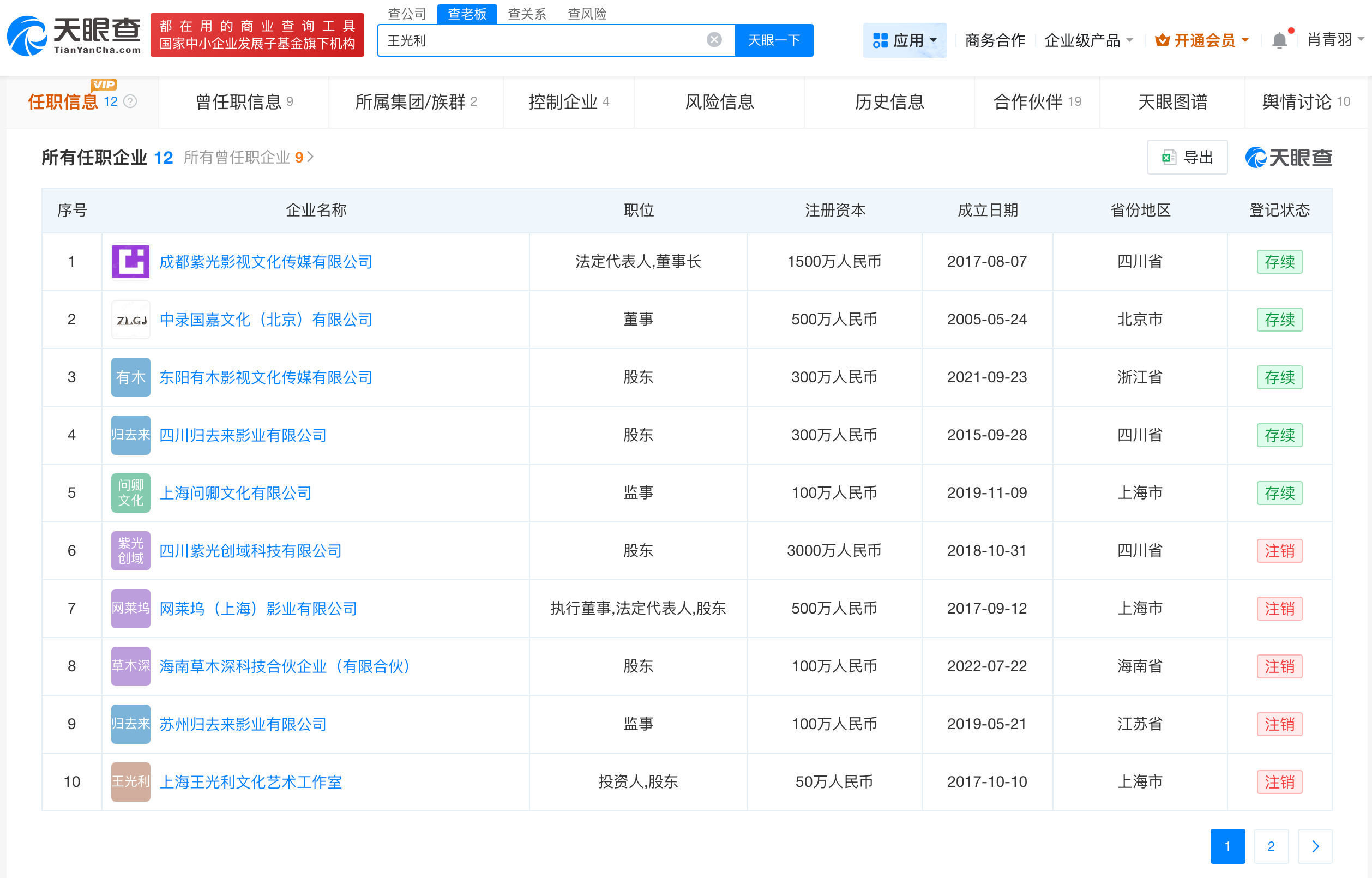 天眼查App显示,王光利名下关联12家企业,其中5家为存续状态,包括成都紫光影视文化传媒有限公司、中录国嘉文化(北京)有限公司、东阳有木影视文化传媒有限公司等,涉及文化传媒等领域,王光利在上述公司担任董事长、监事等职务。值得注意的是,此前,王光利关联的成都紫光影视文化传媒有限公司、中录国嘉文化(北京)有限公司因通过登记的住所或者经营场所无法联系,被列入经营异常名录。此外,成都紫光影视文化传媒有限公司近期发布一则注销备案公告,注销原因为决议解散。
