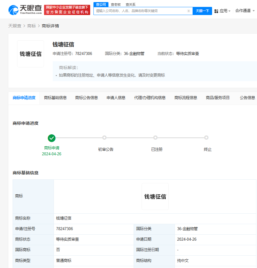 天眼查知识产权信息显示,今年4月,创新先进技术有限公司已申请注册5枚“钱塘征信”商标,国际分类涉及金融物管、教育娱乐、广告销售等,当前商标流程多为“驳回通知发文”。