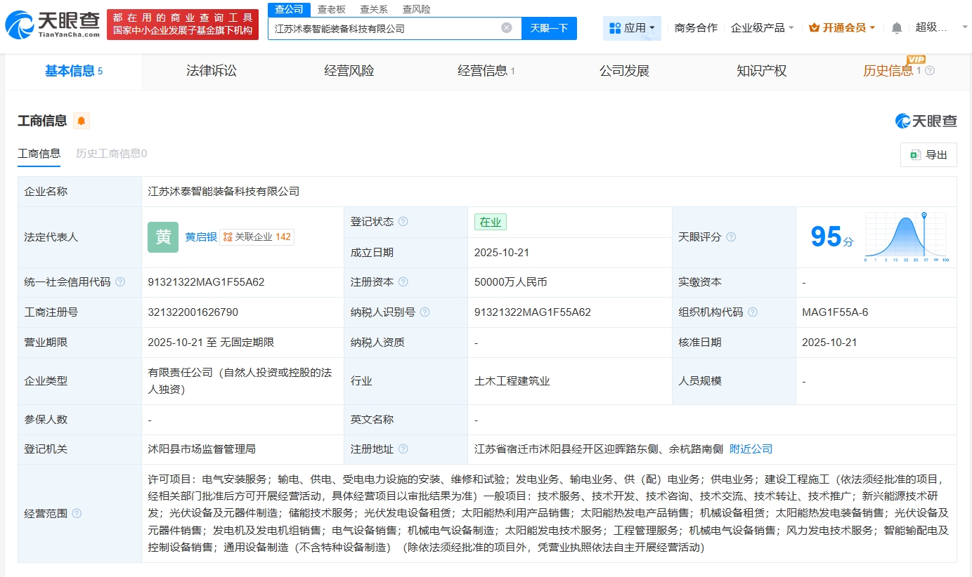 天眼查App显示,近日,江苏沭泰智能装备科技有限公司成立,法定代表人为黄启银,注册资本5亿人民币,经营范围包括新兴能源技术研发、光伏设备及元器件制造、储能技术服务、光伏发电设备租赁等。