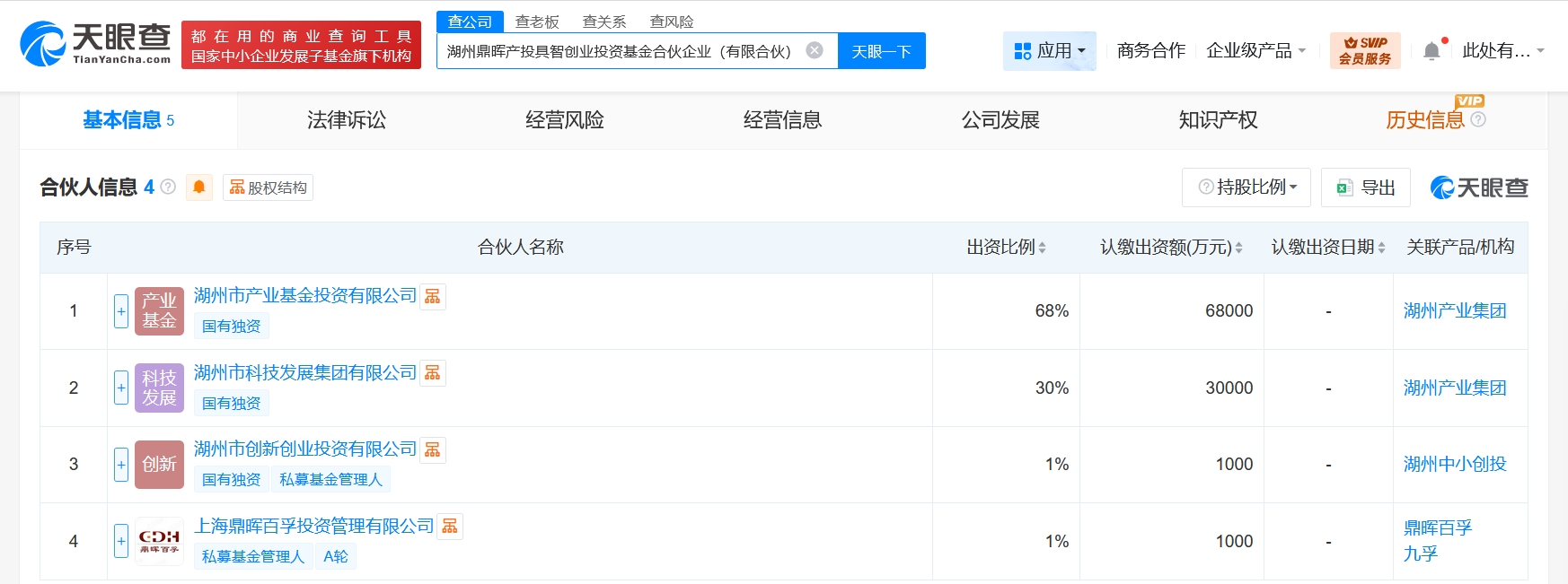 天眼查工商信息显示,近日,湖州鼎晖产投具智创业投资基金合伙企业(有限合伙)成立,执行事务合伙人为上海鼎晖百孚投资管理有限公司,出资额10亿人民币,经营范围含创业投资,以私募基金从事股权投资、投资管理、资产管理等活动。合伙人信息显示,该基金由湖州市产业基金投资有限公司、湖州市科技发展集团有限公司、湖州市创新创业投资有限公司、上海鼎晖百孚投资管理有限公司共同出资。