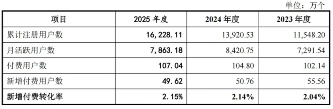 另外,招股书还显示,企查查的年度活跃用户数从2024年度的8420.75万降低至2025年度的7863.18万,减少了558万。而且新增付费用户数也在持续下滑。