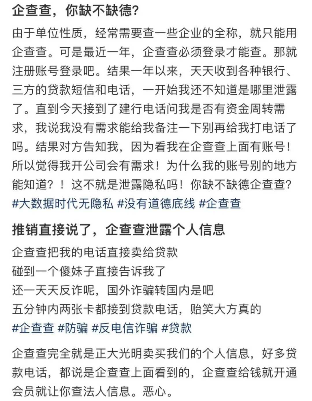 如果只是卖会员,大家也就认了。但很多用户反馈自己注册了企查查后便会收到各类推销、诈骗电话,因此质疑企查查泄露用户隐私。