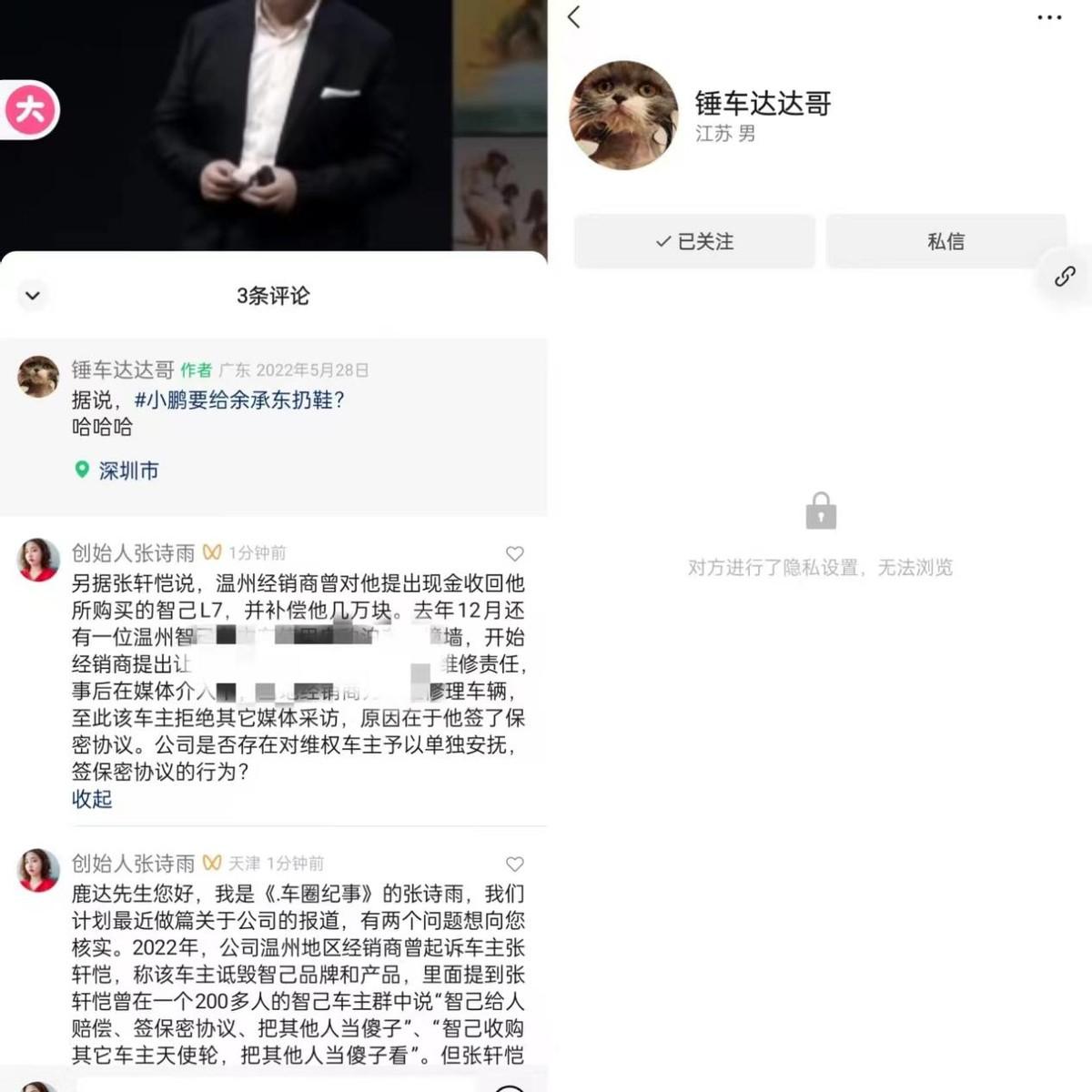 与此同时,在视频号“锤车达达哥”留言区提问后不久,笔者计划询问更多关于智己与车主签订保密协议的问题时,发现该视频号已对笔者设置权限,笔者已无法查看该视频号内容,不能再在留言区评论、提出疑问。