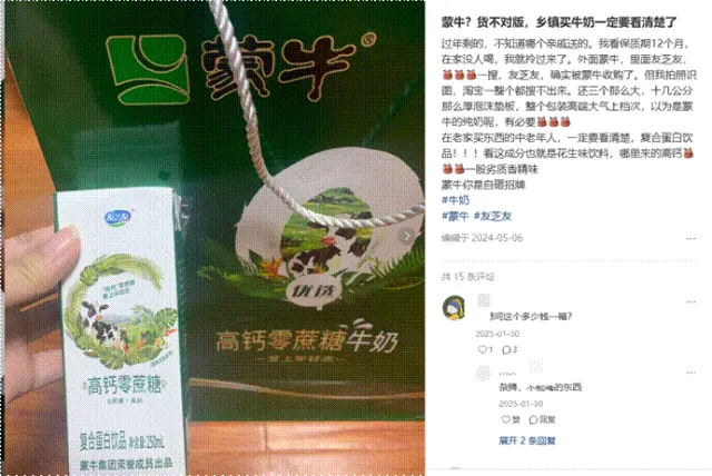 另一边是下沉市场的渠道末端出现的“变脸”现象。春节期间,蒙牛的部分礼盒陷入了“阴阳包装”的争议中——外包装精美大气,里面的产品却与实际不符,用“复合蛋白饮品”冒充纯牛奶,透支了消费者的信任。