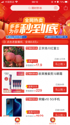 据了解,“多多为你秒到底”活动由拼多多“秒拼”事业群承接,该事业群此前曾举办过“复工复产展销会”“五五折购车”等活动,旗下运营的“限时秒杀”频道更是平台目前流量最大、获客最多的引擎之一。