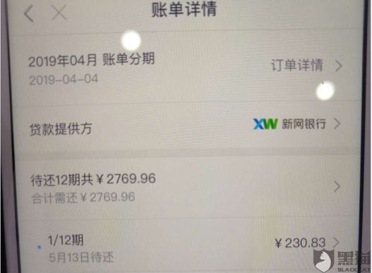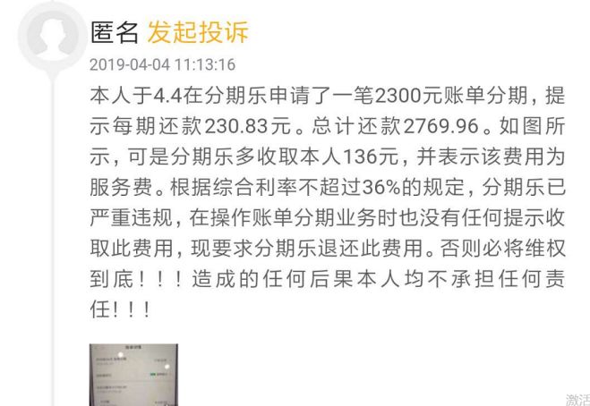 4月3日,网友在“黑猫投诉”发帖投诉称,其在分期乐申请2300元帐单分期,提示每期还款230、83元,总计还款2769.96元,其在帖子中表示,根据综合费率不超过36%的规定,分期乐已严重违规。
