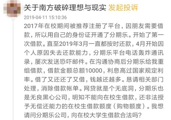 另一位网友在“黑猫投诉”发帖称,其在2017年上学期间,因朋友需要借款,用自己的身份在分期乐开始了第一次借款,直到2019年3月一直按时还款,但4月份开始个人失去还款能力,分期乐电话轰炸,屡次发恐吓邮件。在沟通协商后,分期乐向其重组借款(应该是重新授信的意思),借款总额1万元,利率高过国家规定,借了还还了借,钱越还越多。