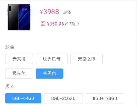 京东自营华为P30(亮黑色)8GB+64GB版本的售价也是3988元。