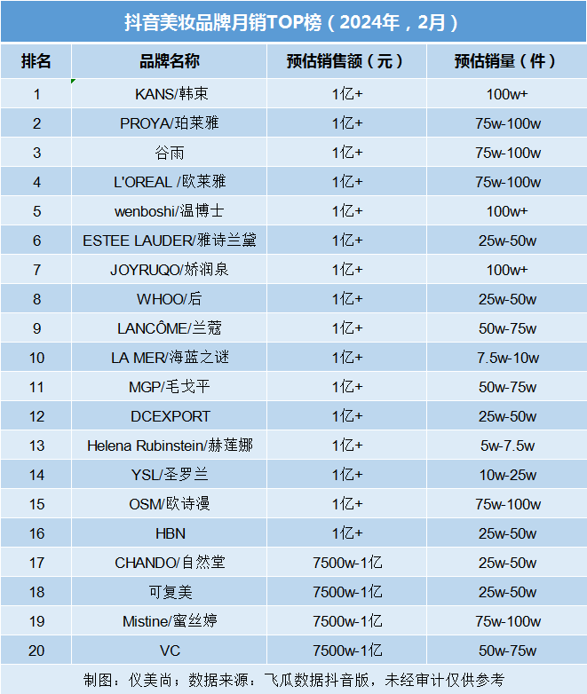 并且,2月美容护肤预估销售额超过5000W元的品牌有3个,彩妆超过500W元的有6个,而1月则分别有4个和14个。