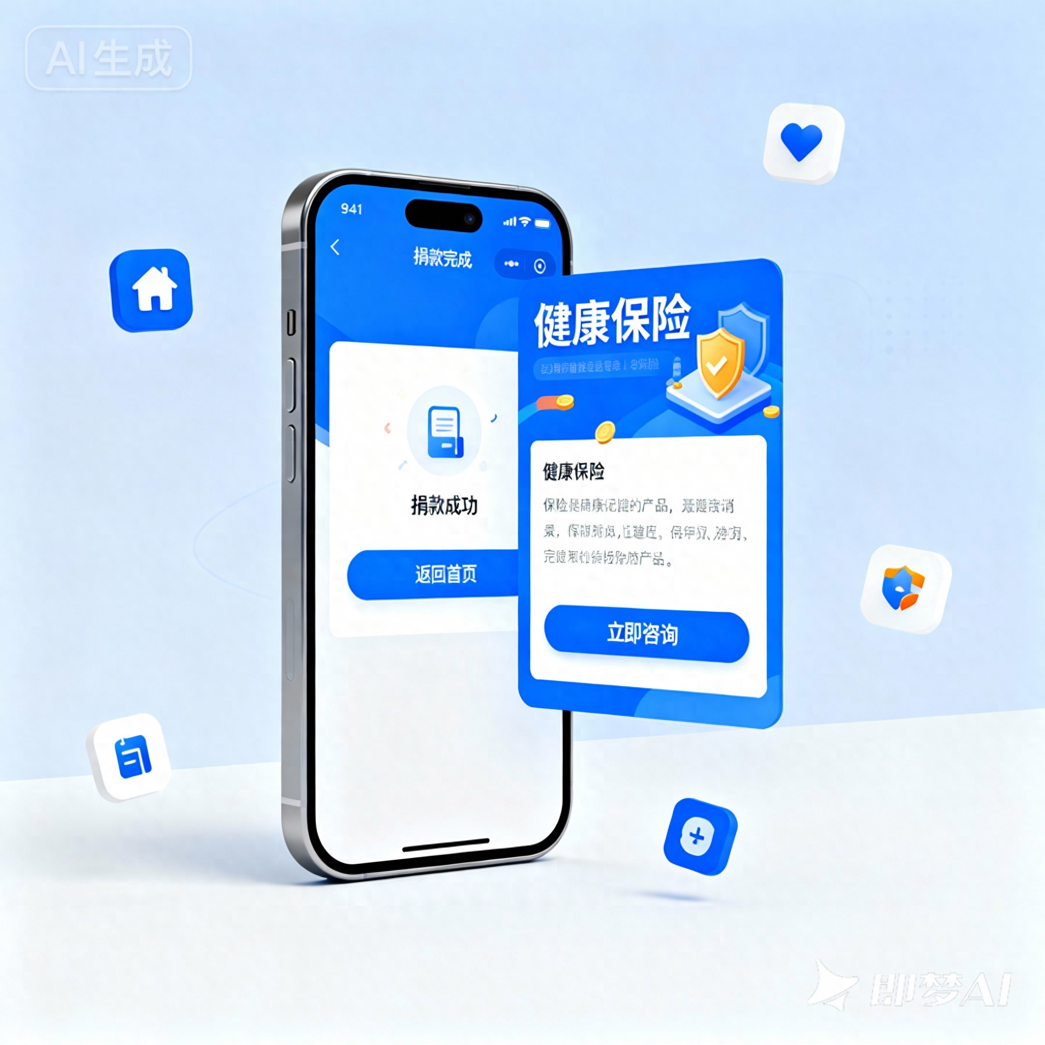 信号新闻实测,在水滴筹捐款后,弹出保险广告页面。(来源:水滴筹)