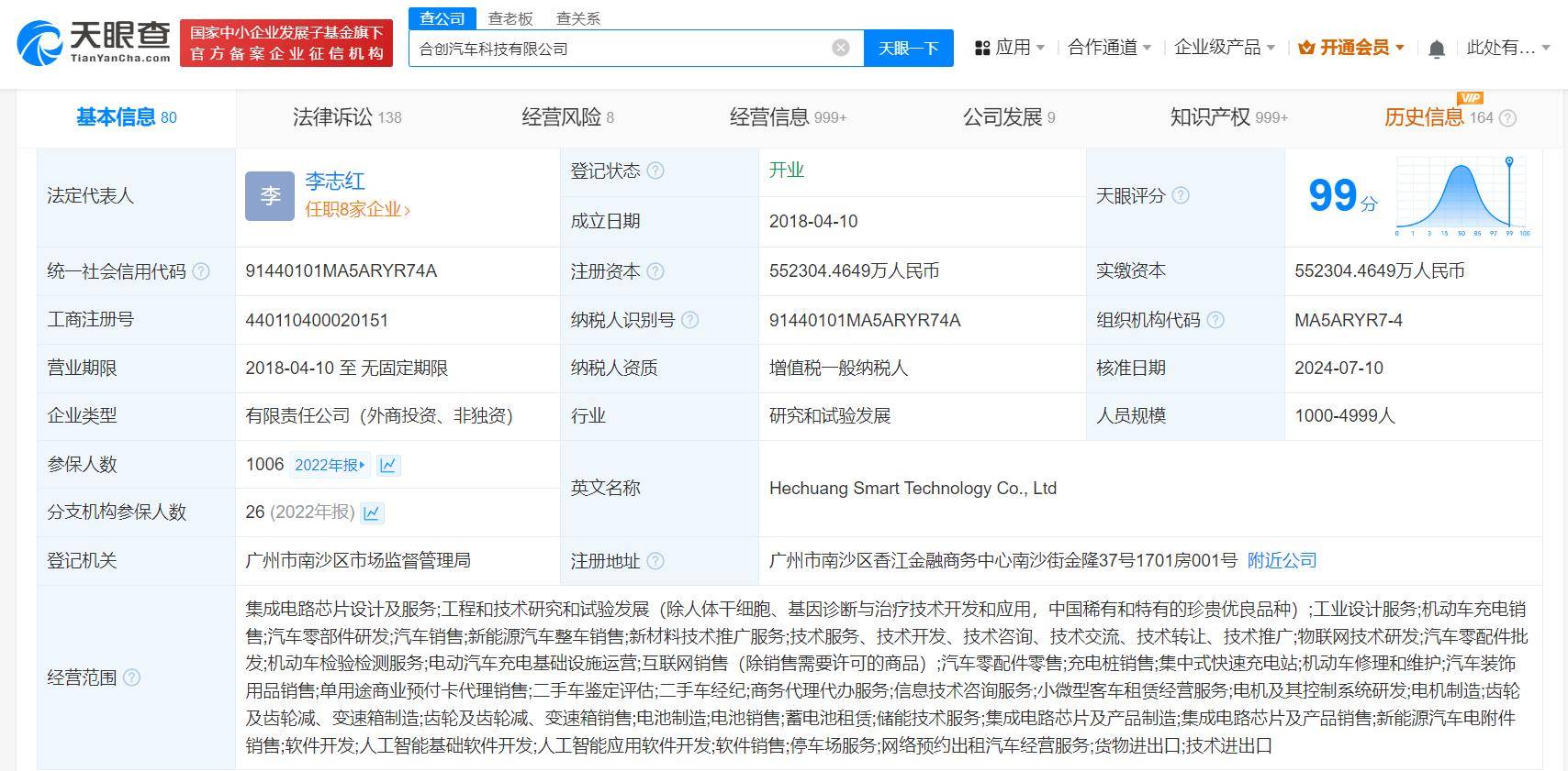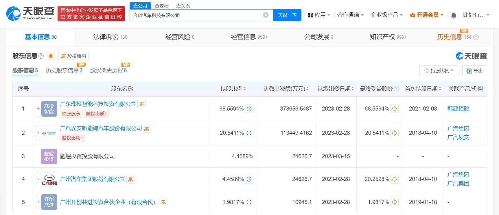 广汽乘用车(杭州)有限公司成立于2010年12月,由广汽乘用车有限公司、合创汽车科技有限公司分别持股51%、49%,其中合创汽车科技有限公司认缴出资额约20.73亿。合创汽车科技有限公司成立于2018年4月,法定代表人为李志红,注册资本约55.23亿人民币,由广东珠投智能科技投资有限公司、广汽埃安新能源汽车股份有限公司、广汽集团(601238)等共同持股。